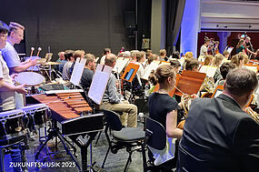Nachdem der Chor und das Orchester getrennt seit einigen Wochen die unterschiedlichen Stücke musikalisch geprobt hatten, wurde es nun ernst. Alle MusikerInnen (Profis und Laien) und die SängerInnen trafen - wie auch in den vorangegangen Jahren im Klubhaus Saalfeld - erstmals aufeinander und die gesamten z. T. extra für die Zukunftsmusik geschriebenen Arrangements erklangen vollständig. In diesem Jahr stehen der Titelsong des letzten Choralbums von 2024 "FALSCH" von KAFFKIEZ, zum wiederholten Mal die Stücke "LITTLE NUMBERS" von BOY und der Song "The Show Must Go On" von QUEEN auf dem Programm.
