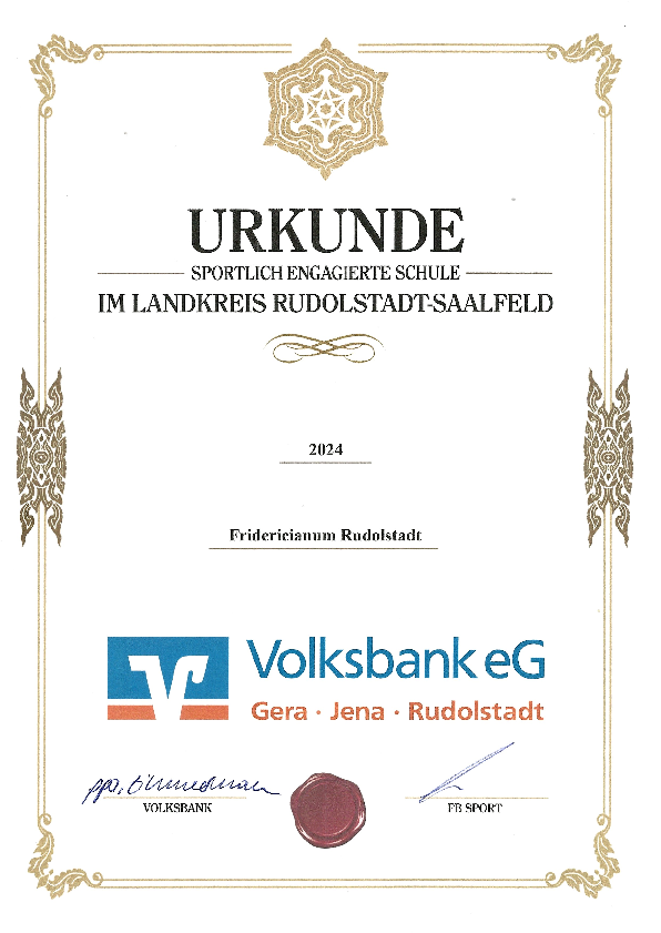 Mit etwas Verspätung aber um so schöner hat unser Gymnasium die Ehrenurkunde für die "Sportlich engagierte Schule", gestiftet von der Volksbank eG Rudolstadt, für 2024 erhalten. Damit wird der hohe Stellenwert des Sports, der sich über das Sport-AG-Angebot, die Anzahl der Teilnahme an den Wettkämpfen vom Kreisfinale bis hin zum Landesfinale zeigt, belohnt. Ohne die Einsatzbereitschaft der Schülerinnen und Schüler, der betreuenden Lehrerinnen und Lehrer und einer dem Schulsport positiv eingestellten Schulleitung wäre dies nicht möglich gewesen.