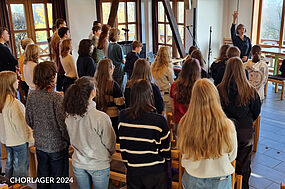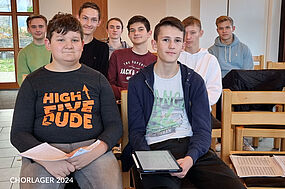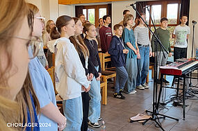 Die intensive Arbeit begann bereits am ersten Abend - in der ersten Probe standen die neuen Arrangements im Mittelpunkt, die in der folgenden Woche erarbeitet werden sollten. Bei ersten Lesedurchläufen konnten sich die Choristen einen Eindruck verschaffen. Danach - wie an jedem Abend - gab es noch etwas Freizeit, die die Sänger:innen auf ihrem Zimmer oder an der Tischtennisplatte verbrachten. Die Großen trafen sich später oben auf der "Couch", um gemeinsam mit dem Chorleiterteam über die Welt als solche zu sinnieren. Andererseits halfen sie auch, dass die Kleineren ihre Nachtruhe ordentlich einhalten konnten, was weitgehend gut funktionierte.