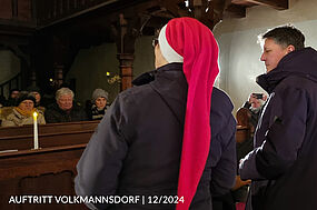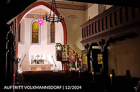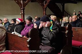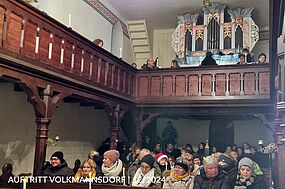 In Anbetracht der vielen Aktivitäten der "Größeren" hatte sich das Chorleiterteam dafür ausgesprochen, dass nur der Termin außerhalb von Rudolstadt vom großen Chor wahrgenommen werden sollte und dort auch nicht mit einem explizit vorweihnachtlichem Programm, sondern mit Songs aus dem Repertoire. Das kam erneut in der Kirche von Volkmannsdorf am Dritten Advent trotz sehr niedriger Temperaturen wieder sehr gut an. Vielen Dank an alle, die der Kälte getrotzt haben.