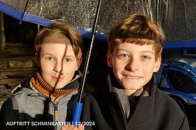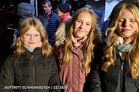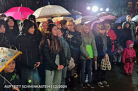 Und schließlich - kurz vor den wohlverdienten Weihnachtferien trotzten die SängerInnen des Nachwuchschores dem Regenwetter. Vor dem Schminkkasten des Theaters fand das traditionelle Weihnachtssingen - auch wieder im Rahmen des "Offenen Adventskalenders statt". Der Intendant Steffen Mensching begrüßte die Zuhörer- und MitsängerInnen mit nachdenklichen Worten und leitete über zum literarisch-musikailischem Reigen. Auch hier beteiligte sich der Nachwuchschor mit seinen eigenen Liedern und stimmte fröhlich in die adventlichen Gesänge, die von den Blechbläsern des Orchesters begleitet wurden mit ein.