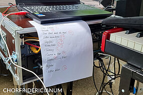 Der Aufbau in mittäglicher Hitze verlief reibungslos - am Nachmittag versammelten sich die Choristen beider Chöre zum Kaffeetrinken und zum Soundcheck. Noch waren alle bester Stimmung und voller Vorfreude. Doch noch während der Soundcheck lief, kam ein heftiges Unwetter auf, die Technik musste schnellstmöglich gesichert werden. Trotzdem fiel auf der Bühne der Strom aus - die entsprechende Sicherung konnte nicht schnell genug gefunden werden. Etwas Hektik kam auf.