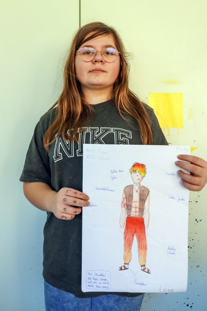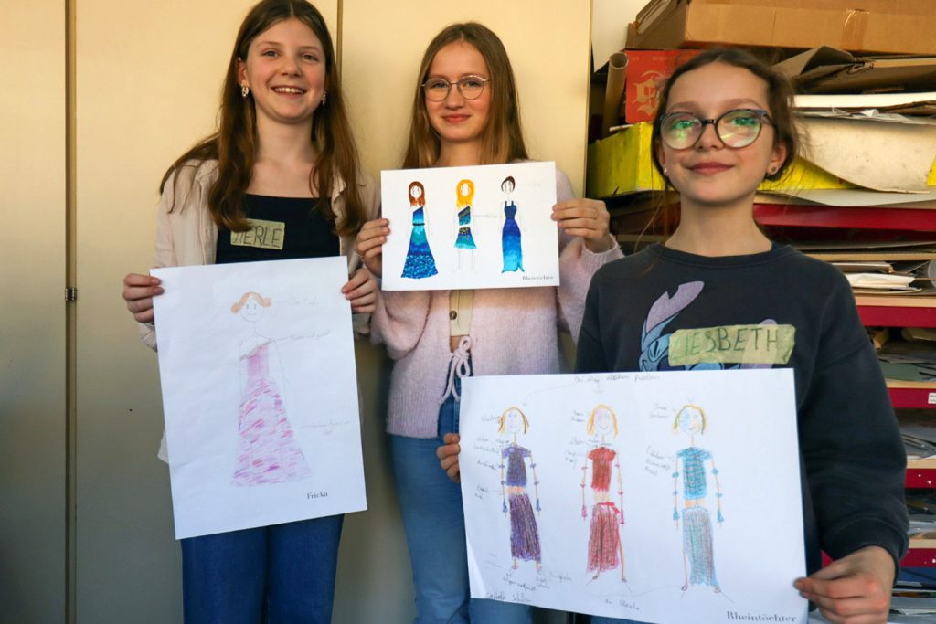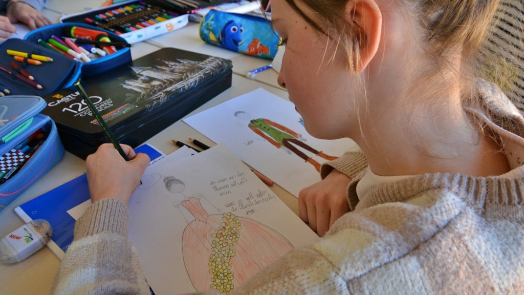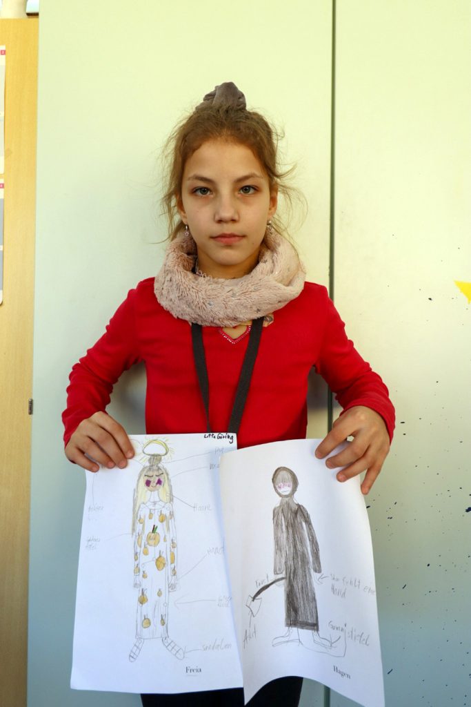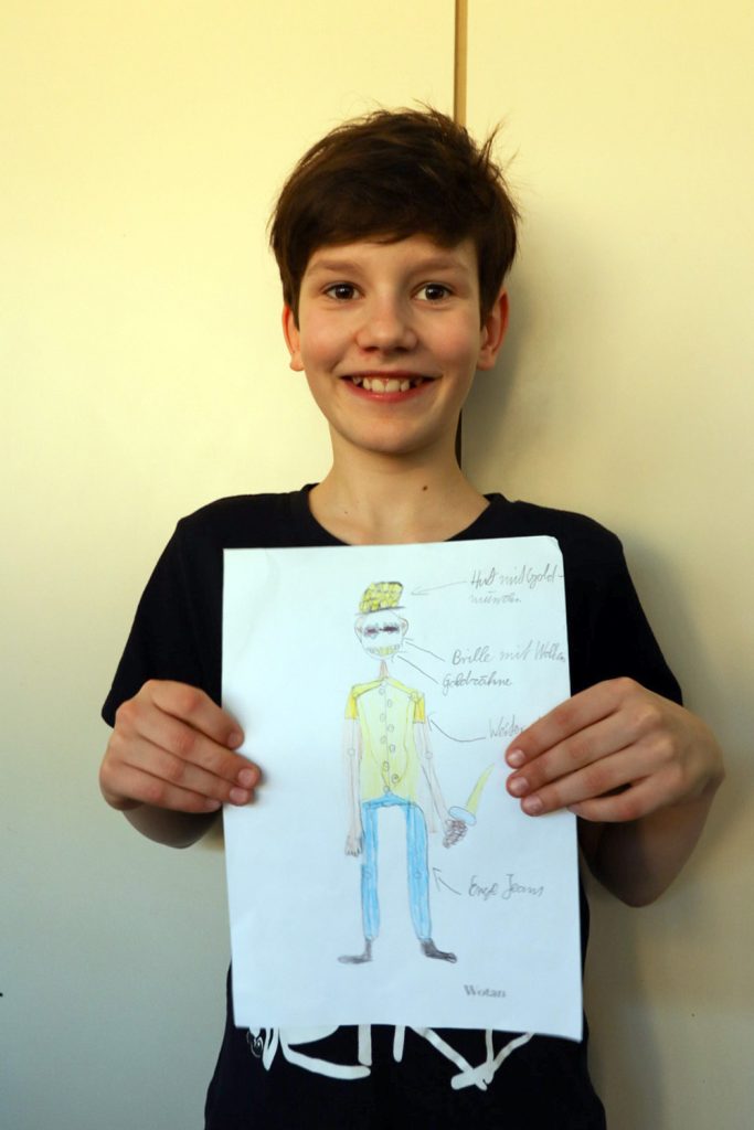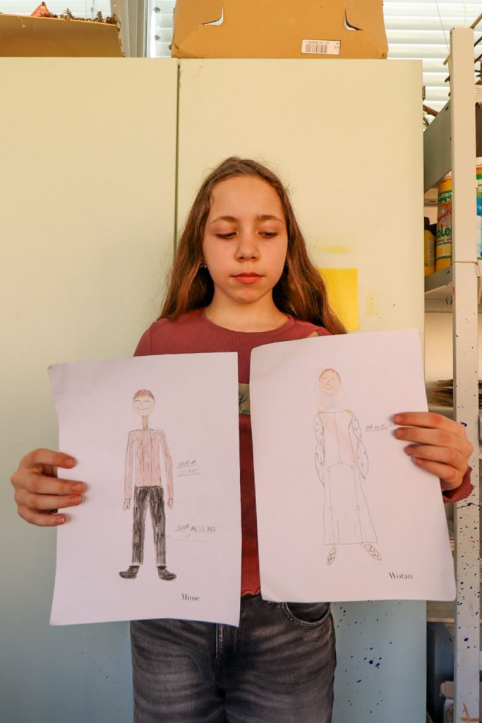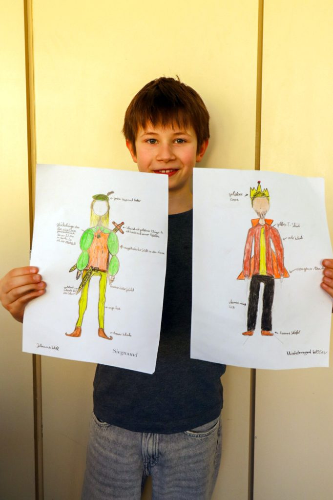 Zwei fünfte Klassen haben den Tag damit verbracht, mögliche Kostüme für die Inszenierung zu entwerfen – unter der Anleitung der Regisseurin des Stücks, der Studentin Leonie Haupt und Bühnenbilddesignerin Charlotte Brandhorst.