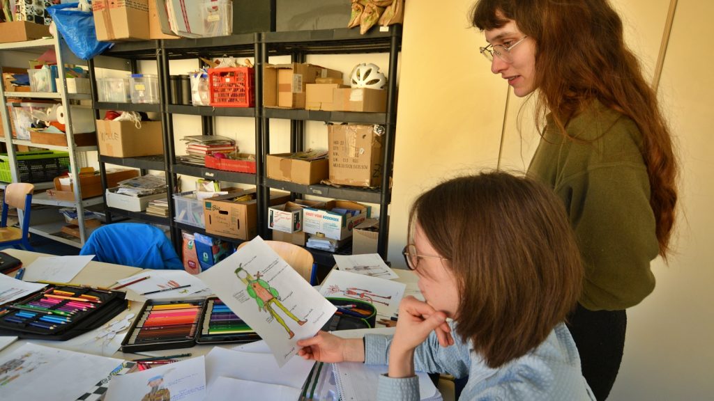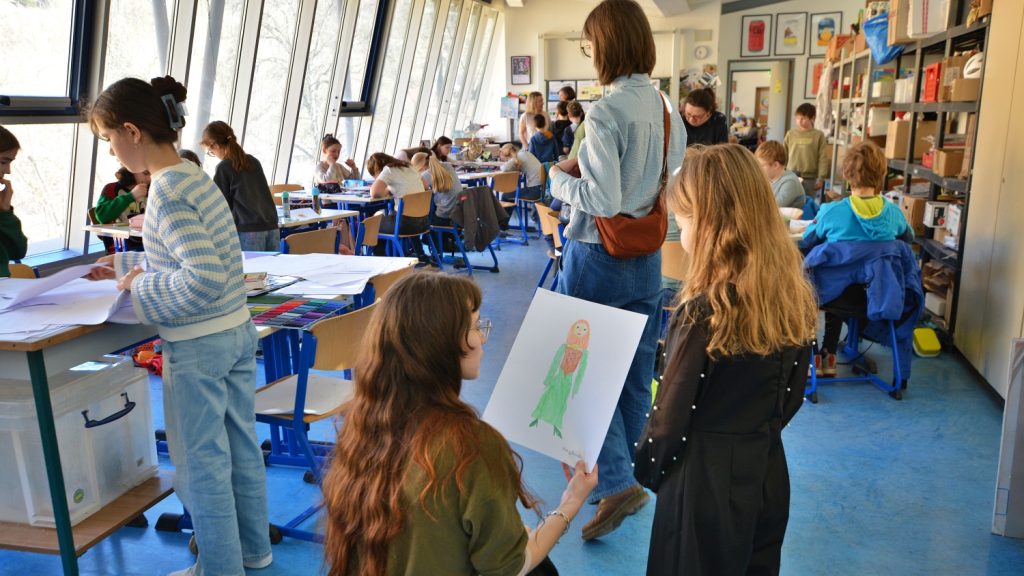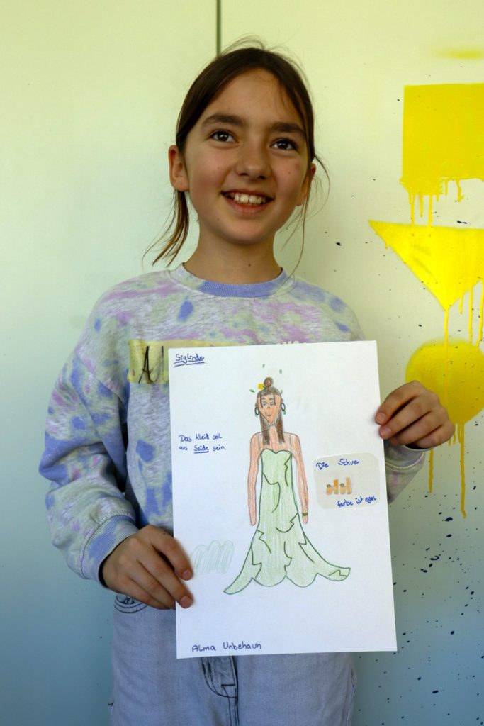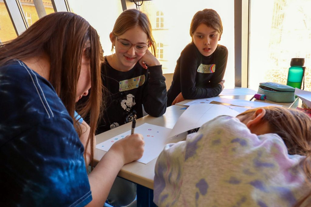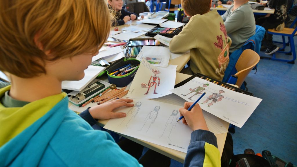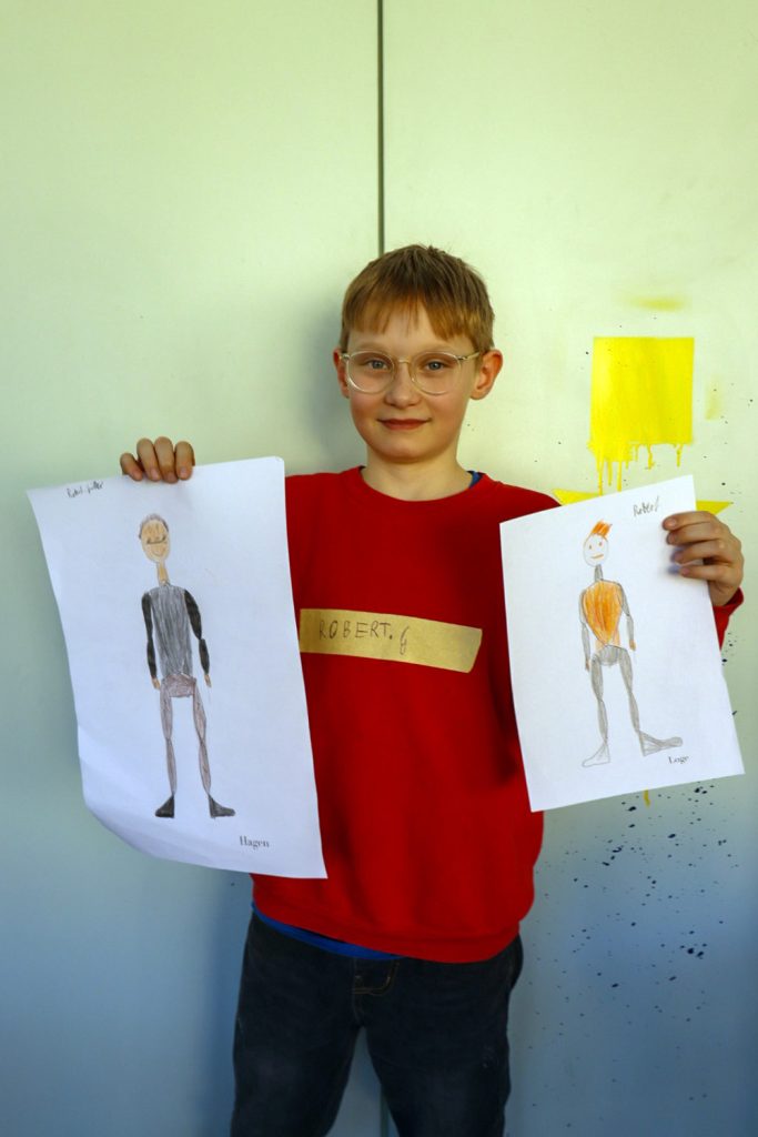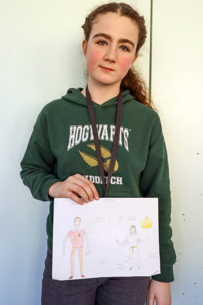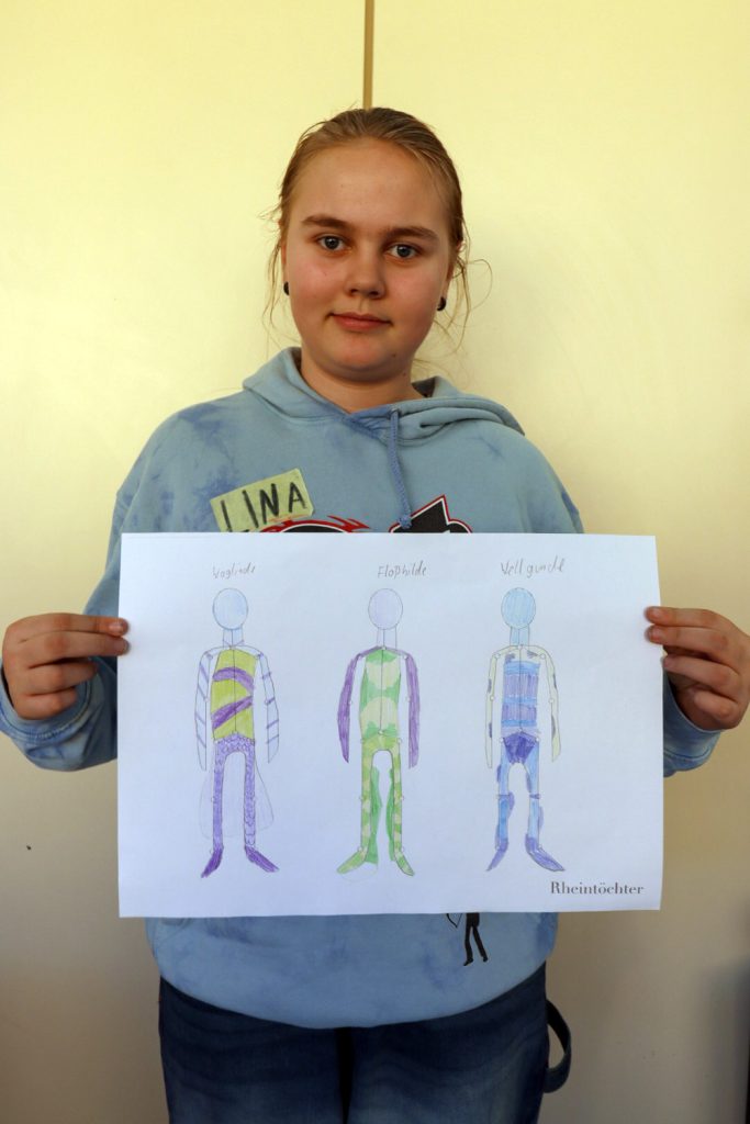 Zwei fünfte Klassen haben den Tag damit verbracht, mögliche Kostüme für die Inszenierung zu entwerfen – unter der Anleitung der Regisseurin des Stücks, der Studentin Leonie Haupt und Bühnenbilddesignerin Charlotte Brandhorst.