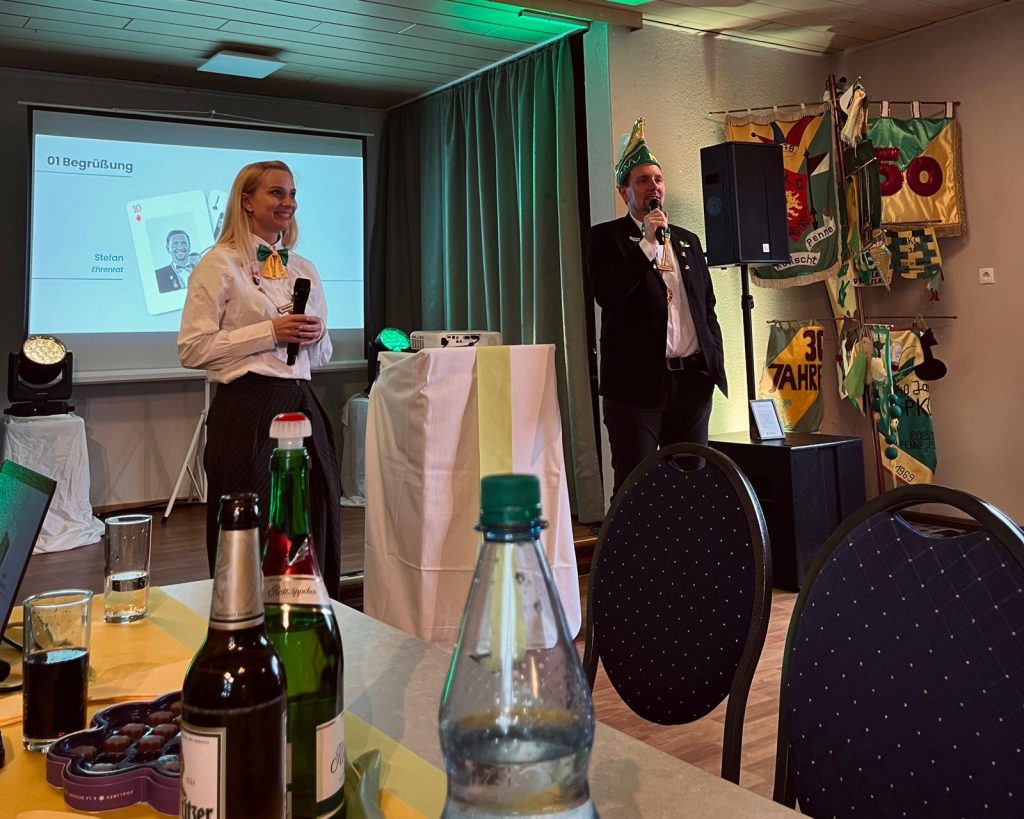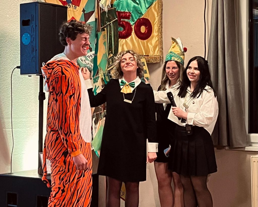 Am späteren Abend wurde es dann noch einmal spannend: Die neuen Anwärter und Anwärterinnen für die Titel „Ehrenrat“ und „Ehrenfunke“ stellten sich ihrer Herausforderung. Innerhalb von 66 Minuten galt es, einen „Mini-PKC-Fasching“ auf die Beine zu stellen und zu präsentieren – eine Aufgabe, die mit Kreativität, Teamgeist und viel Humor gemeistert wurde. Im Anschluss daran konnten Anne, Vick, Victoria und Andreas feierlich in den Kreis der Ehrenräte und Ehrenfunken aufgenommen werden. Der Abend klang schließlich in entspannter Atmosphäre mit vielen Gesprächen, Spielen sowie Musik und Tanz aus und bildete einen gelungenen Abschluss dieses besonderen Tages.