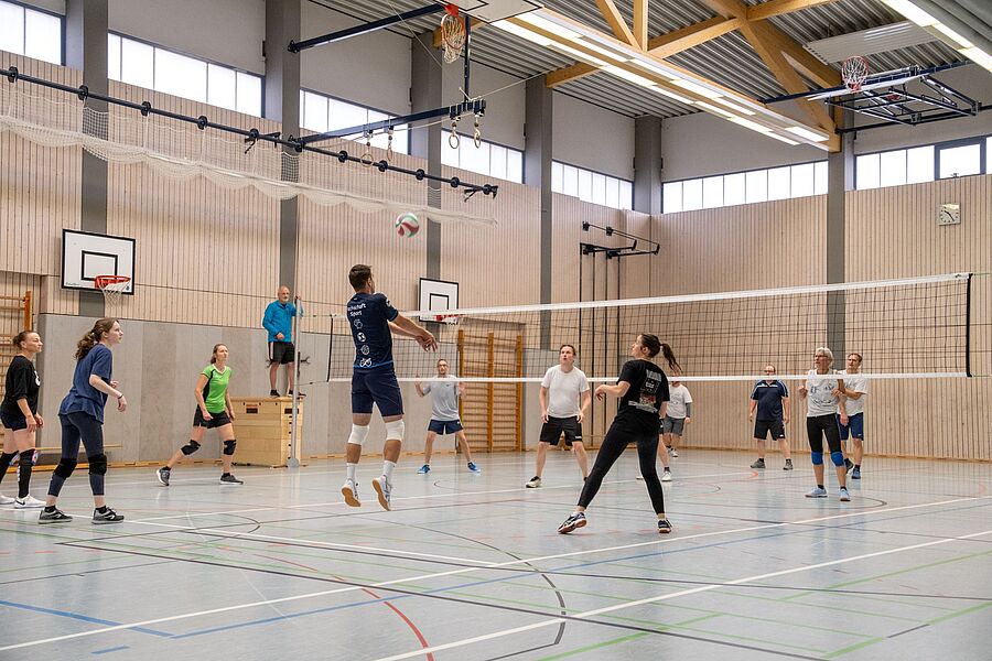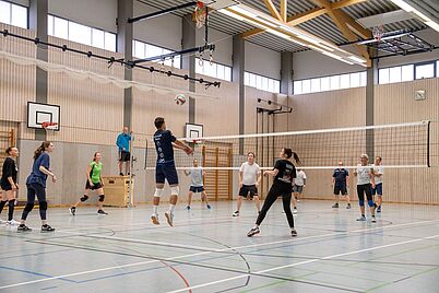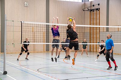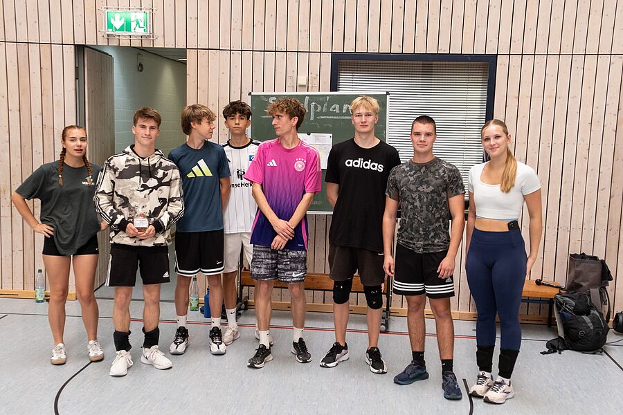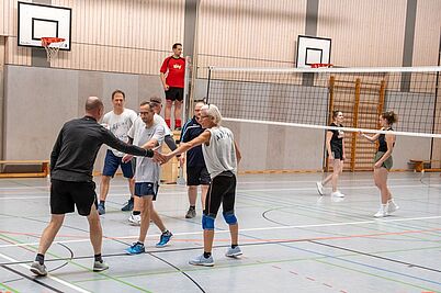 Die angemeldeten 7 Teams trafen sich pünktlich 09.30 Uhr an der Turnhalle, begrüßten sich innig und bereiteten gemeinsam die Spielflächen vor. Pünktlich 10.15 Uhr wurde im Modus "Jeder gegen Jeden" das Turnier angepfiffen. Hier zeigte sich schon deutlich, wer als Favorit in die nächsten Partien gehen wird. In der vierten Spielrunde trafen dann auch die bisher ungeschlagenen Teams der "Netzfetzer" und der "Lörer" aufeinander. Mit spannenden Aktionen, technisch anspruchsvollen Ballwechseln gewannen die jüngeren "Netzfetzer" die Begegnung und sicherten sich somit die Chance auf den Turniersieg. Derweil versorgte der Abijahrgang 2025 die Wettkämpfer vorzüglich mit Kuchen, Bratwürsten und diversen Getränken. Nach drei Stunden straffen Volleyballspiels ohne Verletzungen standen die Platzierungen fest: