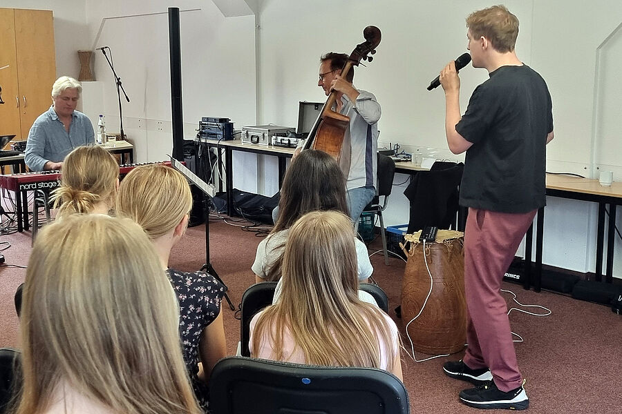 Der Chorlagerdienstag war ein wirklich besonderer Tag, denn an diesem Tag wurde nicht am eigenen Repertoire gearbeitet (nur am Abend). Zu Gast waren drei großartige Musiker - Koryphäen auf ihren Instrumenten und ganz tolle Musikvermittler - ein Kontrabassprofessor aus Weimar, ein Jazzklaviervirtuose aus Berlin und eine junger Beatboxer, Produzent und Songwriter auch aus Berlin.