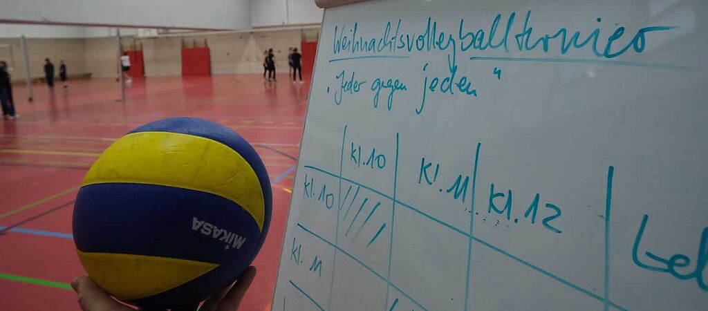 Die Klassenstufen 9-12 sowie SchülerInnen der Volleyball-AG und die Lehrer*innen stellen am letzten Schultag (Freitag, 19.12.2025) vor den Weihnachtsferien ihre Mixteams (siehe Aushang Schule) auf. Es wird mit Mixed-Teams (min. 2 Frauen pro Team) gespielt und jeder Jahrgang stellt ein Team. Wir spielen in zwei Gruppen und jedes Spiel wird mit einem Satz bis 15 Punkte entschieden.