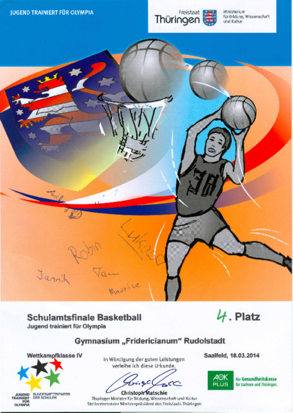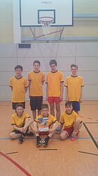 Das Jungenteam unserer Schule verpasste die Chance im Schulamtsfinale eine bessere Platzierung zu belegen. In einem gleichstarken Teilnehmerfeld, Modus "Jeder gegen Jeden", wurden drei Spiele bestritten. Zu Beginn hieß es gegen das GY Neuhaus zu Punkten. Anfangs gelang es gut doch mit der Zeit schlichen sich vermehrt Deckungsfehler ein. So musste man in die Verlängerung und konnte nach schön rausgespielten Treffern den Sieg mit nehmen. Mit dem zweiten Gegner, der RS Römhild, hielt unser Team bis zur ersten Halbzeit gut mit - Unentschieden. Zur zweiten Hälfte schlief die Verteidigung zwei mal und so zogen die Römhilder mit sechs Punkten in Führung. Bei gefühlten 10 nicht genutzten Korbwurfversuchen verloren die Jungen dieses Spiel auf Augenhöhe. Die letzte Begegnung gegen das Gymnasium Kaltensundheim verlief wie das vorangegangene Spiel - jede Menge Chancen und wenig Ausbeute. Zwei Fehlpässe, zwei Konter und schon lag man mit vier Punkten zurück. Ein genialer Dreipunktewurf von Robin Hofmann lies Hoffnung aufkommen, doch da man das Spiel öffnen musste, fing man sich einen erneuten Konter ein und verlor mit sechs Punkten Unterschied.