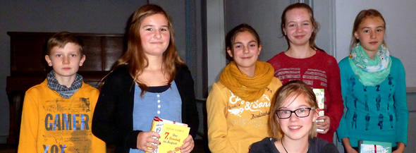 Für die Klasse 6a lasen Amelie Kühn und Julian Zunft vor, für die 6b Nathalie Gier und Tammy Liemich. Die Klasse 6c wurde von Josephine Rollinger und Julina Marie Friese vertreten. Trotz großer Aufregung lasen alle Klassensieger mit sehr guter Lesetechnik und hatten sich eine passende Interpretation ihrer Texte überlegt. Ihre Buchauswahl bot etwas für die verschiedensten Leseinteressen: Märchen, wie „Der Zauberer der Smaragdenstadt“ von A. Wolkow, phantastische Geschichten, wie „Sculduggery Pleasant“ von D. Landry, und Erzählungen, wie „Der 7. Sonntag im August“ von S. Ludwig oder „Ein Jahr ohne Juli“ von L. Kessler. Auch eine Liebesgeschichte fehlte nicht in der Auswahl: „Liebe, Chaos, Schmetterlinge“ von I. Zimmermann.