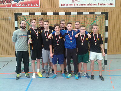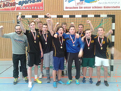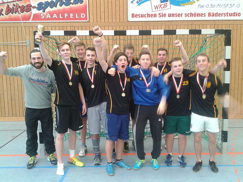 SLF/Gorndorf: Die Jungen der WK II (98/99) des Fridericianums Rudolstadt gewannen am Dienstag, den 20.01.2015, das Schulamtsfinale im Handball. Aufgrund der Absage des Sonneberger Teams musste unsere Mannschaft lediglich einen Gegner bezwingen, um in das Landesfinale, am 26.02.2015, in Eisenach, einzuziehen. Gesagt getan. Gegen die Regelschüler aus Behringen lieferten die Jungs eine beherzte Leistung ab. Gleich von Beginn an wurde das Torepolster kontinuierlich ausgebaut. Aus einer starken Abwehr heraus wurde das Spiel nach vorn eröffnet und die Angriffe zu meist ruhig und überlegt mit zahlreichen Torerfolgen abgeschlossen. Dank einer geschlossenen Mannschaftsleistung stand dem Sieg am Ende nichts mehr im Wege. Die Regie auf dem Feld führten Christian Bleeck und Felix Vofrei. Im Tor konnte sich Max Kleinspehn ein ums andere Mal sehenswert auszeichnen und brachte den Gegner mit seinen starken Paraden an den Rand der Verzweiflung.