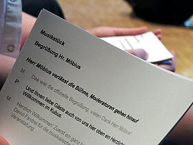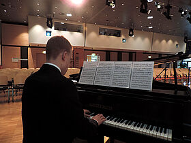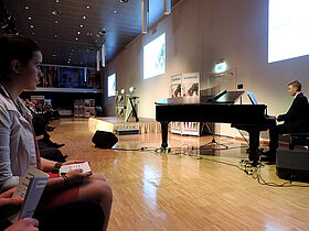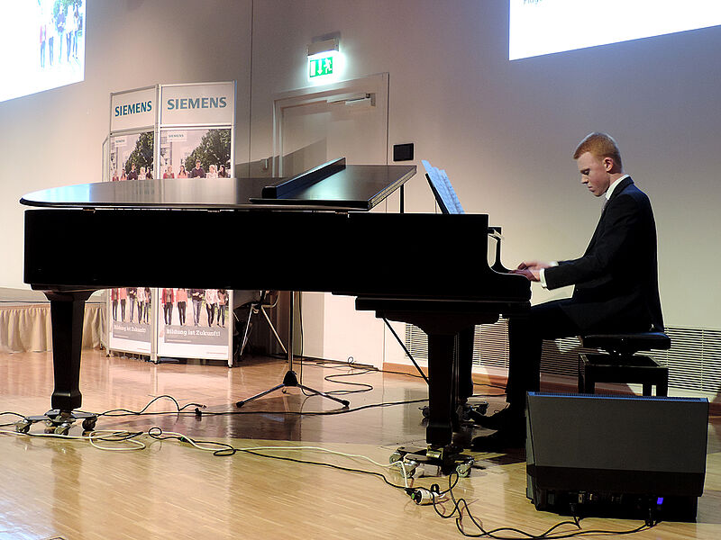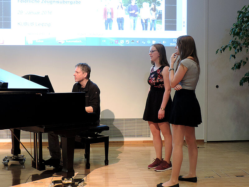 David Fandrei spielte das Eröffnungsmusikstück am Flügel. Mit Claude Debussy's "Prélude" aus der Suite "Bergamasque" zog er das Publikum in seinen Bann und sorgte so für einen feierlichen Beginn der Veranstaltung. Nach einigen Grußworten und der Festrede sangen die Solisten Johanna Olitzsch und Laura Reimer den Song "Little Numbers" von BOY, begleitet von Herrn Haupt am Flügel. Der intonationssichere und ausdrucksstarke Gesang der beiden jungen Sängerinnen wurde mit viel Beifall honoriert.