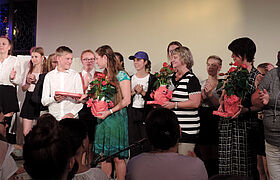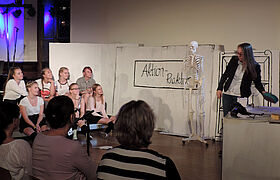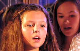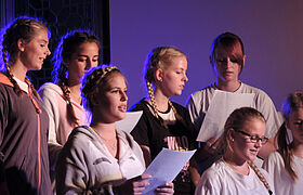Unter dem Titel "Die Kinder der Madame Mathieu" hatte der Kurs "Darstellen und Gestalten" unter Leitung von Frau Reinhardt den oscarprämierten Film "Die Kinder des Monsieur Mathieu" umgeschrieben und eine Bühnenfassung passend für unsere Räumlichkeiten und die reine Mädchengruppe erarbeitet.