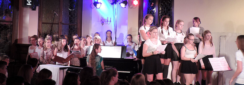Bei unserem Theaterstück kam es zur Zusammenarbeit mit dem Nachwuchschor unter Leitung von Frau Streller. Die Choristen sangen dabei die deutschen und französischen Originaltitel des Filmes live.