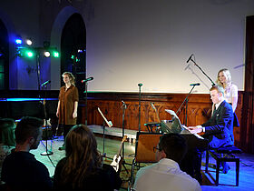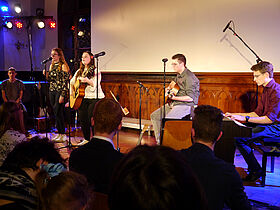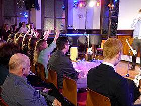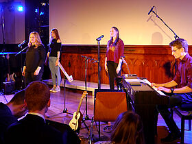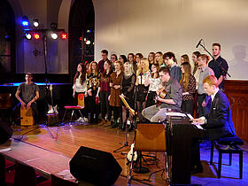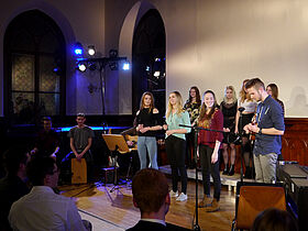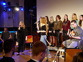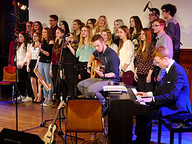 In Eigenregie hatten die Schüler ihr Programm erstellt, Verantwortlichkeiten verteilt und die Probentermine abgesprochen. Noch bis kurz vor der Aufführung wurde an einzelnen Liedern und der Moderation gefeilt, bis sich schon eine Stunde vor Programmbeginn erste Zuhörer vor der Aula sammelten, um gute Sitzplätze zu ergattern.