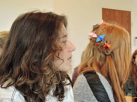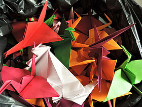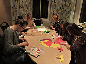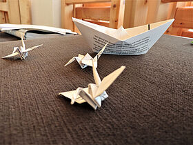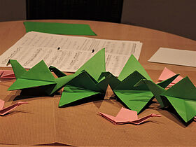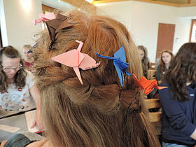 Neben körperlicher Betätigung, stundenlangem Proben, wurde in der knapp bemessenen Freizeit in zahlreichen Aufenthaltsräumen intensiv Fingerfitness betrieben. Zum Schluss waren mehrere Säcke voll gefaltetem Papier das Ergebnis der Mühen. Viele filigran gebastelte Kraniche waren entstanden. Diese werden als Bühnenbild bei unserem Chorkonzert wiederzufinden sein. Die Frage, wofür die Kraniche als Symbol stehen, wird sich im Laufe des Konzerts auflösen. Was zu Beginn bei einigen Chorschülern zur kompletten Verzweiflung führte, erwies sich später als gemeinsame Akkordarbeit und wurde zum Marathonbasteln, bis wir am Ende der Woche über 1000 Kraniche gefaltet und damit unser selbstgestecktes Ziel mehr als erreicht hatten.