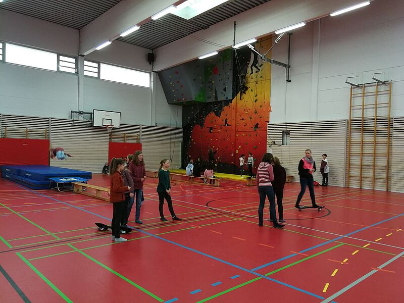 Am Samstag, 24.02.1018, lud die Fachschaft Sport innerhalb des "Tages der offenen Tür" am Gymnasium Fridericianum zur "offenen Turnhalle" ein. Von 10 bis 13 Uhr nutzten viele SchülerInnen aber auch zukünftige Fünftklässler und deren Eltern das umfangreiche Bewegungsangebot in der hellerleuchteten und warmen Turnhalle. Dies reichte über Tischtennis, Unihockey, Basketball, Badminton, Volleyball bis hin zu Waveboardfahren, Trampolinspringen und Klettern an der Kletterwand.