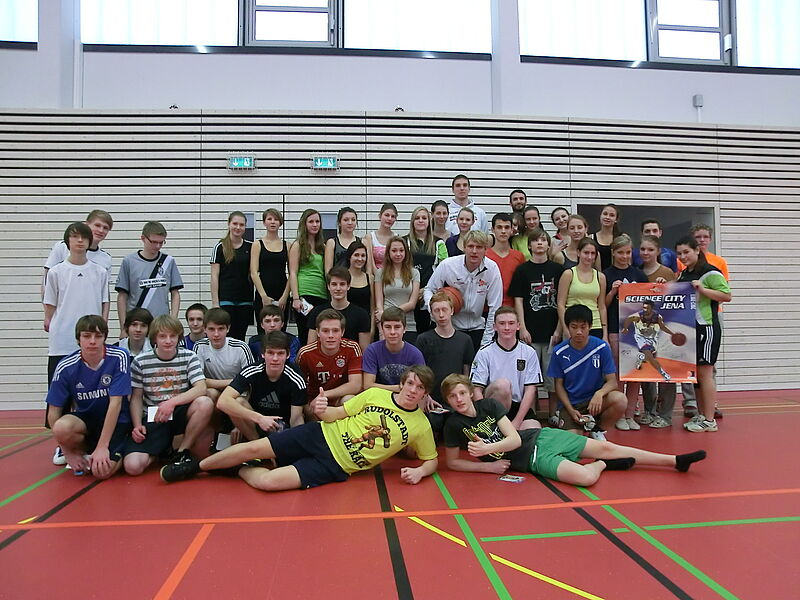Nachdem am Nikolaustag die langersehnte Eröffnung der neuen Sporthalle in Rudolstadt gefeiert wurde stand schon eine Woche später ein Highlight auf dem Programm. Die Schülerinnen und Schüler der zehnten Klassen kamen in den Genuss, zwei besondere Sportstunden zu erleben. Diesmal waren es nicht die Sportlehrer der Schule, die die Kids bewegen wollten sondern die Basketballprofis aus Jena waren zu Gast. Und, um es vorweg zu nehmen, am Ende der zwei Stunden floss so mancher Tropfen Schweiß über die Gesichter der Jugendlichen. Mischa Zlotowski, ehemaliger Weltklassespieler und Initiator der School-Tour brachte zwei der derzeit Besten im Team von Science City Jena mit. Die beiden Stars übten, spielten, warfen und demonstrierten mit den Schülern Dinge, die man beim Basketball beherrschen muss und so mancher staunte nicht schlecht, was man mit solch einem Basketball so alles anstellen kann. Zwei dieser neuen Basketbälle wurden wieder der Schule überreicht, gesponsort von der Volks- und Reiffeisenbank Rudolstadt, ohne deren Engagement solche Aktivitäten nicht durchführbar wären. Nach gut zwei Stunden aktiver Bewegung in denen Würfe, Passfolgen und Spielsituationen geübt wurden, zeigten die Profis noch einige Kabinettstückchen aus ihrem Training. Im Anschluss beantworteten die Stars Fragen nach Ihrer Herkunft, Dopingvergehen, den Gründen in Jena zu spielen usw. die allesamt auf Englisch gestellt wurden. Und so endeten zwei intensive Sportstunden mit dem Abschlussfoto aller Beteiligten, mit Autogrammkarten der Profis und mit der Möglichkeit, dass die Jugendlichen ein Heimspiel der Jenenser besuchen dürfen, bei denen sie keinen Eintritt bezahlen brauchen. Mit dem Versprechen, solch eine Besuch zu wiederholen verabschiedete man sich, wünschte sich eine gute und erfolgreiche Zeit auch im Jahr 2013, hoffentlich dann in Play-Off Spielen.