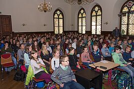 Anlass ist die Teilnahme unserer Schule als Zuschauer am Biathlon- Weltcup (05. Januar 2017) in Oberhof, die durch den großzügigen Einsatz der Firma TSB Technik Service Betrieb Schwarza GmbH ermöglicht wird. Die Aula war mit 5 Schülern pro Klasse prall gefüllt, und alle waren gespannt auf den ehemaligen Bundestrainer der Biathleten und Langläufer.