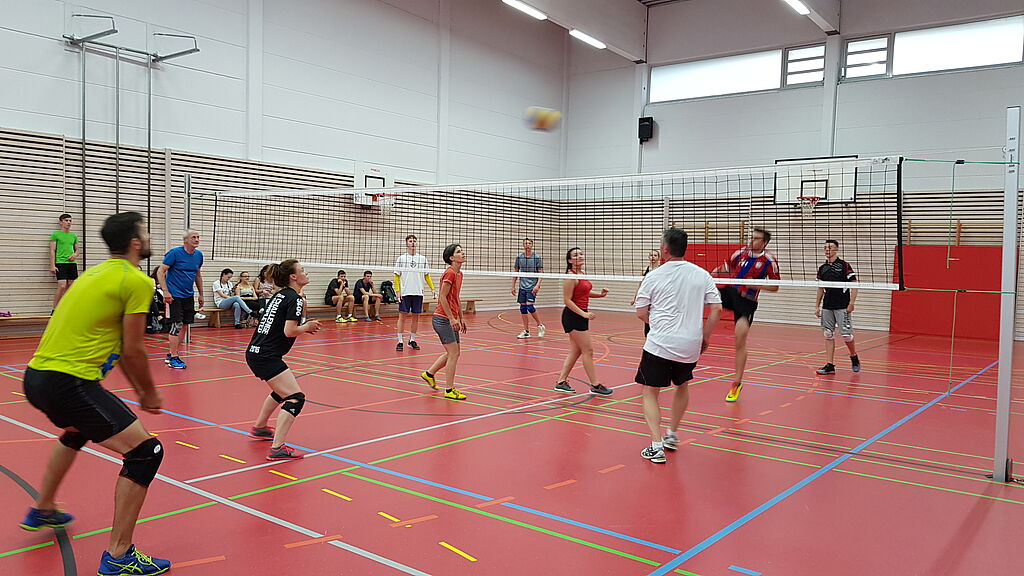 Das Traditionsspiel SchülerInnen 11 versus Lehrer fand ab 14.00 Uhr in der Turnhalle des Gymnasiums statt. Diesmal hatten sich die elften Klassen Verstärkung in Form von mehreren Zuschauern geholt - die Stimmung war dementsprechend gut.