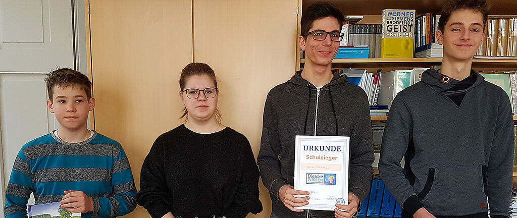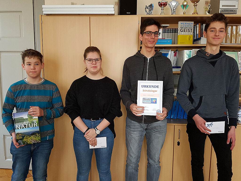 Allgemeinwissen und Fachwissen bewies auch der diesjährige Schulsieger, Felix Schoetzau aus der Klasse 10b, der deutlich vor dem Zweitplatzierten, Jakob Breternitz aus der Klasse 10c, und der Drittplatzierten, Madlen Engel aus der Klasse 10b, lag. Ein Achtungszeichen setzte Jonna Grandke aus der Klasse 7b, die bei der Beantwortung des gleichen Fragebogens ebenfalls schon viel Wissen zeigte. Dafür erhielt sie aus den Händen des Schulleiters einen Buchpreis.