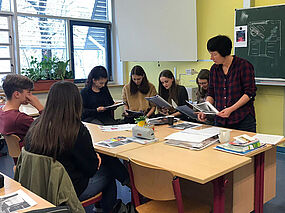 Im Vorfeld der Premiere übernahm Frau Lenz Anfang Januar 2019 drei Stunden im Rahmen des Deutschunterrichts der Klasse 9c, in denen sie den Schülern teilweise informierend, teilweise projektorientiert einen relativ tiefen Einblick in die Erarbeitung der Inszenierung des Stückes gab. Sie begann mit Ausführungen zur Suche nach geeigneter Literatur und Auswahlkriterien, dann gab sie einen Überblick über den Inhalt und gesellschaftlichen Hintergrund des Geschehens. Anschließend bezog sie die Schüler ein und ließ sie selbst überlegen, welche Kriterien für die Aufführung wichtig seien. Sie erklärte ihnen Rahmenbedingungen, wie Bühnengröße, Auf- und Abgangsmöglichkeiten oder das Budget, und ließ sie Vorschläge zur Bühnengestaltung unterbreiten. Sie teilte mit den Schülern Überlegungen zum Einsatz von Requisiten, Kostümen, Licht, Geräuschen bzw. Musik oder Leinwandprojektionen für den Hintergrund. Auf der Grundlage von szenischem Lesen wurden ein Stück weit die Charaktere analysiert.