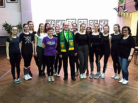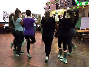 Eine ganz wichtige Begegnung von Schülerinnen unseres Gymnasiums mit der irischen Kultur war ein Tanzworkshop in der ehemaligen Kleinkunstbühne am Samstagvormittag. Die stellvertretende Schulleiterin und Deutschlehrerin der weiterführenden Schule Coláiste Ailigh, Una Ni Bhriain, brachte den Mitgliedern unserer Funkengarde und einigen weiteren Mädchen einen irischen Tanz, den Bonfire Dance, bei. Mit diesem Tanz eröffneten sie den irischen Abend im Festzelt.