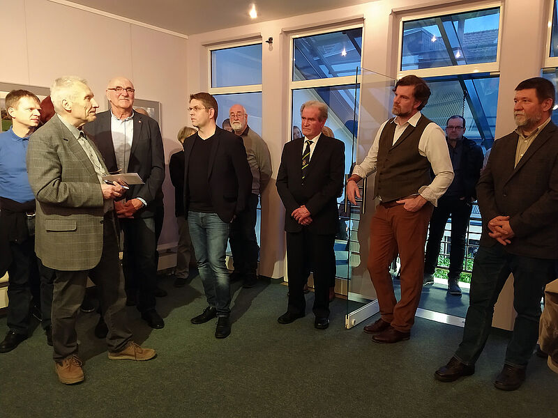 Am Freitag, dem 15. März, konnten sie dem Musiker erneut begegnen, denn er umrahmte auch die Eröffnung einer Ausstellung mit Fotografien von Andreas Irmscher in der KulTourDiele, zu der eine Delegation von ca. 30 irischen Gästen aus Letterkenny, allen voran der 1930 geborene Bürgermeister Ian McGarvey, begrüßt wurde.