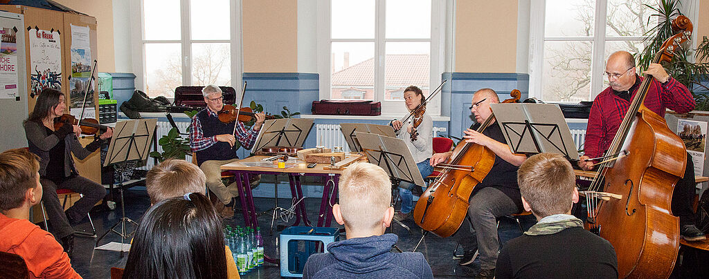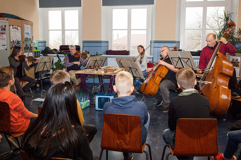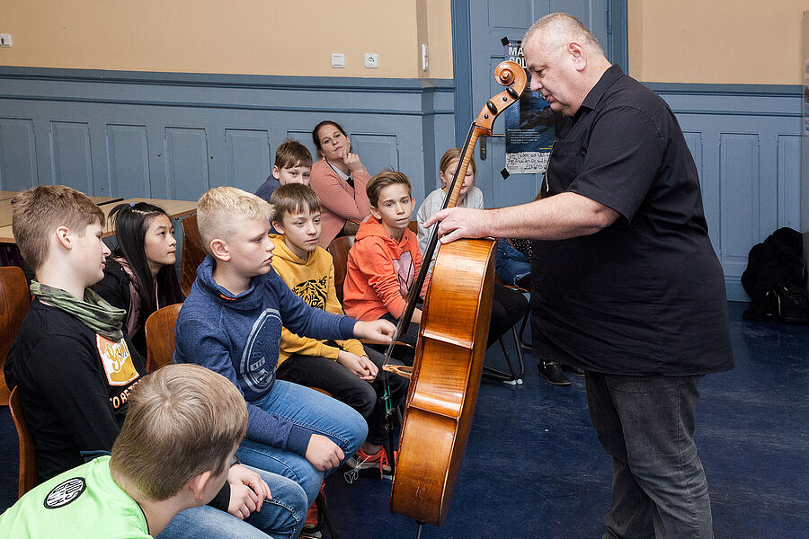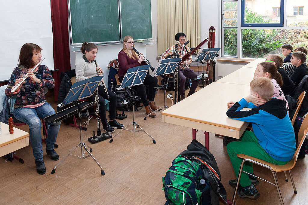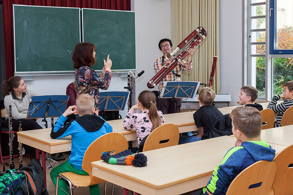 "Wenn das Fach Musik auf dem Stundenplan steht, dann kann es passieren, dass die Schüler der 5. oder 6. Klassen Besuch bekommen. In vier kleinen Formationen begeben sich die Musiker mitsamt ihrem Instrument auf die Reise, um dieses zusammen mit kleinen Musikstücken direkt im Klassenzimmer vorzustellen."