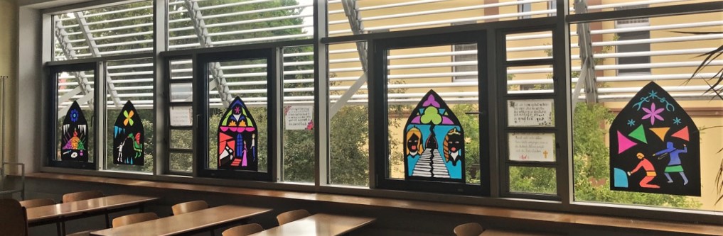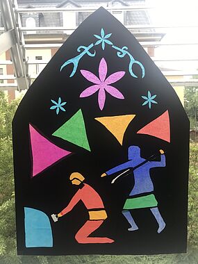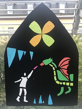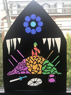 Nachdem wir Auszüge des Heldenliedes gelesen und besprochen hatten, arbeiteten wir mit schwarzem und buntem Papier an der bildhaften Darstellung einzelner Szenen. Am Ende kamen wunderschöne Fensterbilder heraus.