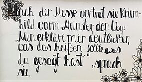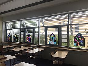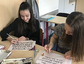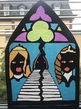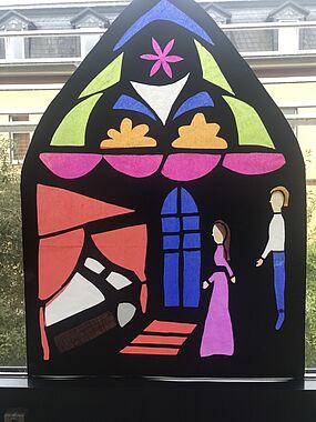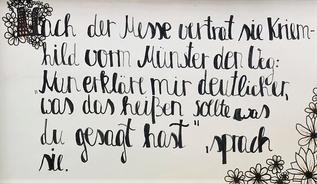 In ihnen wurde auch unser Wissen über gotische Architektur eingebaut. Außerdem schrieben zwei Schülerinnen einzelne Strophen des Liedes mit Feder und Tusche auf Pergamentpapier.
