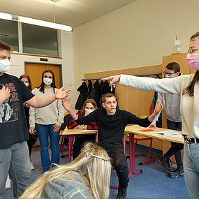 Am 17. März 2022 durften die Schülerinnen und Schüler dann abends eine Probe des Stückes im Theater anschauen. Das war oft lustig, weil die Schauspieler viel Humor zeigten, und interessant, weil man so eine Probe ja im Alltag nicht zu sehen bekommt.