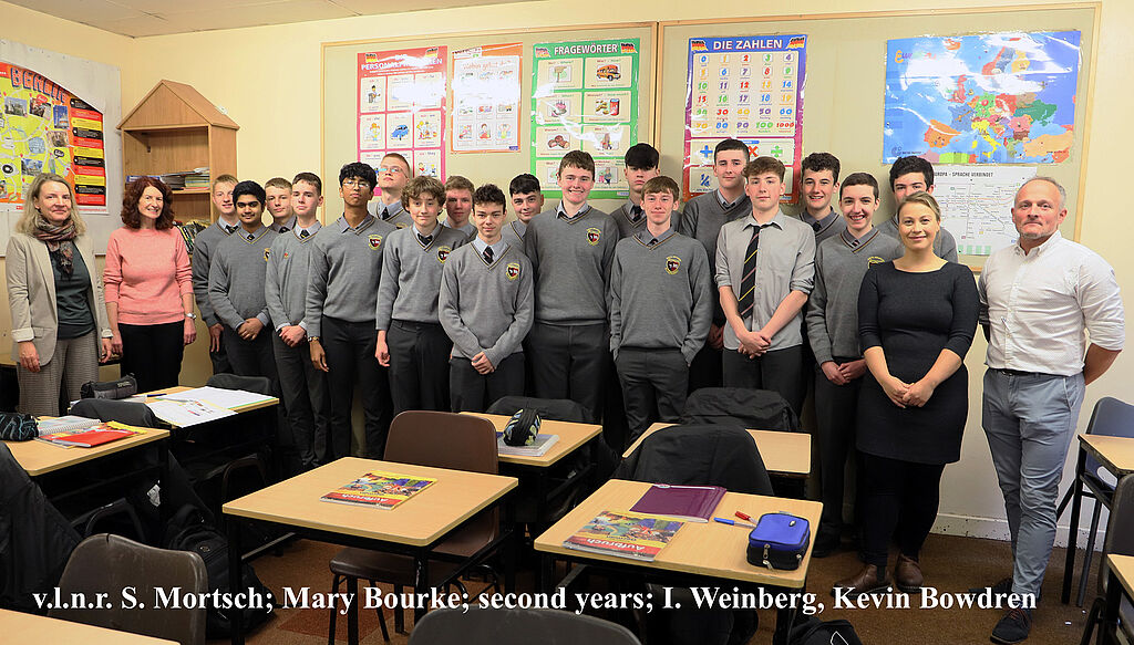 Am Montag, d. 26.09.2022, wurden sie von Kevin Bowdren (Deutsch/Chinesisch) mit offenen Armen empfangen sowie mit dem Schulgebäude und irischen KollegInnen vertraut gemacht. Sehr herzlich war der Austausch mit der Deutschlehrerin Mary Bourke, mit deren second und third year Deutschklassen (8. Klasse, 11. und 12. Klasse) Frau Weinberg und Frau Mortsch an diesem Vormittag den Deutschunterricht gestalteten. Als „warming up“ dienten einfacheFragen auf Deutsch an die jungen Männer, denn das St. Eunan’s ist eine reine Jungenschule. Fragen nach dem deutschen Schulalltag, der Schulkleidung als auch zu Sportmöglichkeiten interessierten die irischen Schüler besonders. Im landeskundlichen Teil lernten sie unsere Heimatstadt und den Unterricht am Fridericianum kennen. An dieser Stelle bedanken wir uns recht herzlich bei den SchülerInnen der Klassen 6a (Lina, Guilina, Maja, Emilia und Felicia); 7a; 7c; 8c und 9b für deren Briefe, Videobotschaften und künstlerischen Arbeiten, die wir im Unterricht vor Ort einbringen konnten.