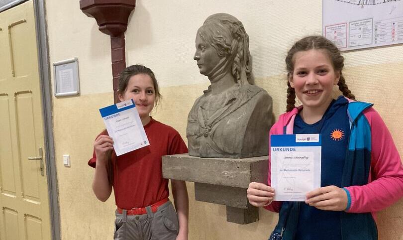 Ausschlaggebend war die Gesamtpunktzahl in der Kreisrunde im Vergleich zu allen anderen Kreisen in Thüringen. Somit ist es äußerst erfreulich, dass von insgesamt 181 Teilnehmer:innen aus allen Gymnasien und den Spezialschulen im Freistaat neun Schüler:innen von den vier Gymnasien aus dem Landkreis vertreten waren, darunter zwei Schülerinnen unserer Schule: Klara Conrath und Emma Scheinpflug.