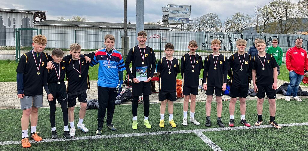 Bei diesem traf man wieder auf das Team des GY Königsee, welches vorher das GY Böll glücklich und kämpferisch mit 1:0 geschlagen hatte. Aber auch hier wurde der Ball schnell und taktisch klug durch die Reihen der Königseeer Abwehr gespielt, zahlreiche Torchancen herausgespielt. Mit zwei Toren wurde dieses Finalspiel gewonnen und so fahren die Jungen unseres Gymnasiums am 11.05.2023 zum Schulamtsfinale nach Saalfeld. Dort wartet die nächste Aufgabe auf die gut aufspielenden Kicker. Viel Erfolg!