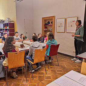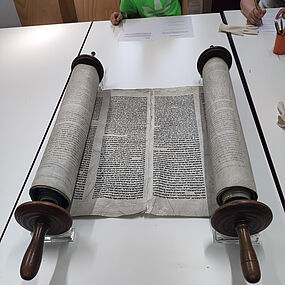 Am zweiten Tag arbeiteten die Schüler kreativ in der Schule, lernten in Stationsarbeit das Leben in einer jüdischen Familie oder Feste und Feiertage im Judentum kennen. Einen Höhepunkt an diesem Tag bildete zweifellos der Besuch der Judaica auf unserer Heidecksburg – der wahrscheinlich größten Sammlung jüdischer Exponate, die den Pogrom auf deutschem Boden überlebt haben. Die Schüler zeigten sich beeindruckt davon, welche wertvollen Schätze in unserer Heidecksburg aufbewahrt werden, wie eine Thora, eine Gebetstafel, ein Thorazeiger sowie die alten hebräischen Bücher, eine kostbare Pultdecke sowie dem 7-armigen Leuchter und die im Magazin geschützt aufbewahrten Thorawimpel.