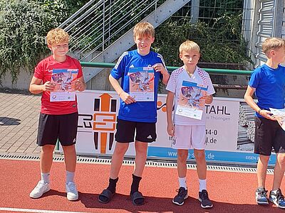 Aufgrund der heißen Wettervorhersage starteten die Wettkämpfe mit den 800m-Läufen der Mädchen und Jungen. Mit Begeisterung feuerten die teilnehmenden SchülerInnen ihre KlassenkameradInnen an. So manche WettkämpferInnen wuchsen dadurch über sich hinaus (Jasmin 2:34). Nach den Entscheidungen im Sprint, Wurf, Weit- und Hochsprung sowie 800m-Lauf wurden die Platzierungen in einem knappen Ergebnis zusammengefasst - Platz 1 und 2 bei den Jungen trennten nur 65 Mehrkampfpunkt!e - und die Jungen haben gewonnen!