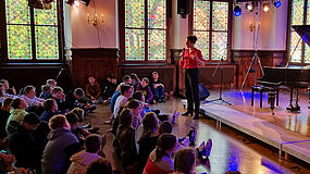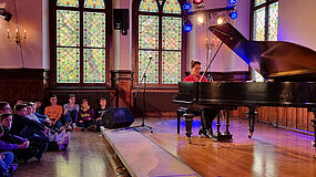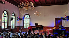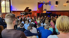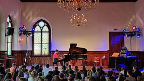 Leider war die Unruhe - geschuldet wahrscheinlich auch der unbequemen Sitzposition der SchülerInnen - doch recht hoch, sodass sich auch bei der Musikdarbietung der wunderschönen Klaviermusik von Schumann, Clementi, Mozart und Beethoven nie so richtig Ruhe einstellen wollte. Dennoch, das Feedback der SchülerInnen fiel im Nachhinein doch insgesamt recht positiv aus - Musikvermittlung und Musikunterricht, der dann doch funktionierte - wenn auch auf andere Art und Weise.