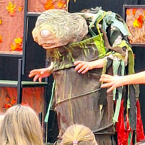 Für die Klassenstufen 5 und 6 gab es „The Dark Lord and the White Witch“ zu sehen, das an die Trilogie „Lord of the Rings“ angelehnt war. In altbekannter Manier ging es farbenfroh, verrückt und vor allem lustig zu. Mit vollem schauspielerischem und körperlichem Einsatz begeisterten die 4 Schauspieler – allesamt aus England – das junge Publikum. Wie immer wurden die Schüler selbst Teil der Aufführung, was vor allem die 5. Klässler in Aufregung versetzte. Erstaunlich mutig zeigten sich die Schüler dann auch am Ende, als sie Fragen an die Schauspieler stellen durften und waren sehr stolz, dass sie verstanden wurden und spannende Antworten erhielten.