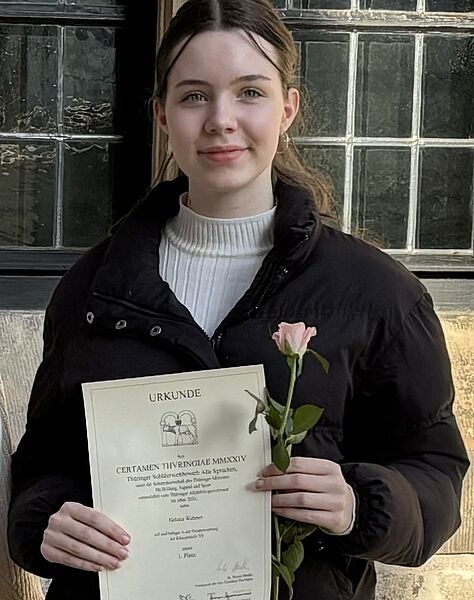 Für eine unserer TeilnehmerInnen zahlte sich die Anstrengung der Wettbewerbsteilnahme besonders aus. Am 14.03.2024 besuchte Helena Wehner (Kl. 8c) zusammen mit Frau Flaig und Frau Mortsch die Preisverleihung durch den Thüringer Altphilologenverband und das Thillm im Augustinerkloster in Erfurt. Dort erst erfuhr sie, dass sie unter den 83 Thüringer TeilnehmerInnen ihrer Alterstufe den 1. Platz belegt hat und somit die beste Lateinschülerin Thüringens der Klassenstufe 8 ist. Wir sind sehr stolz auf dich, Helena!