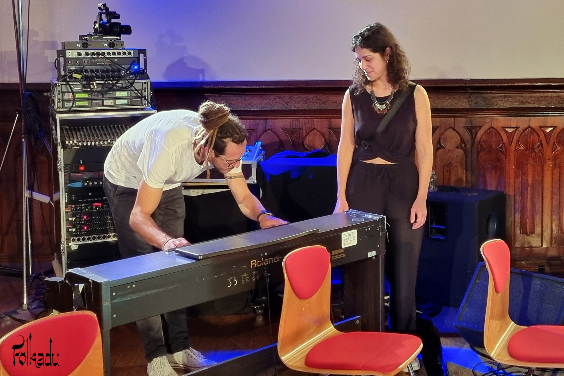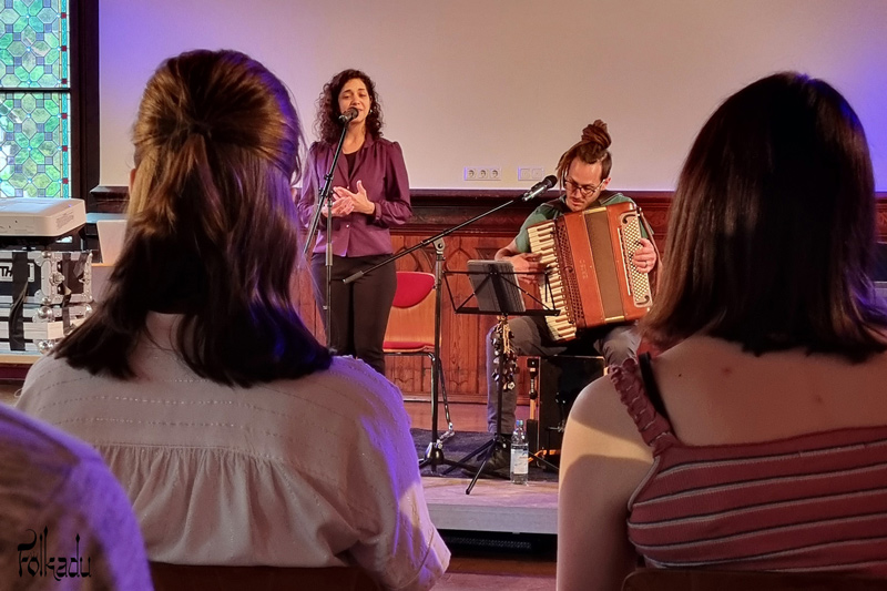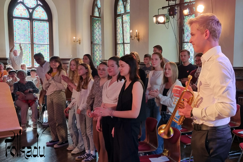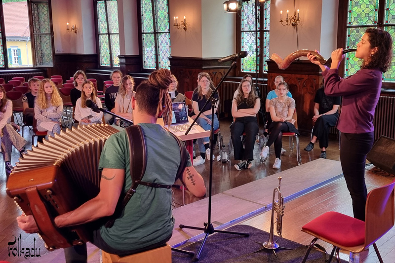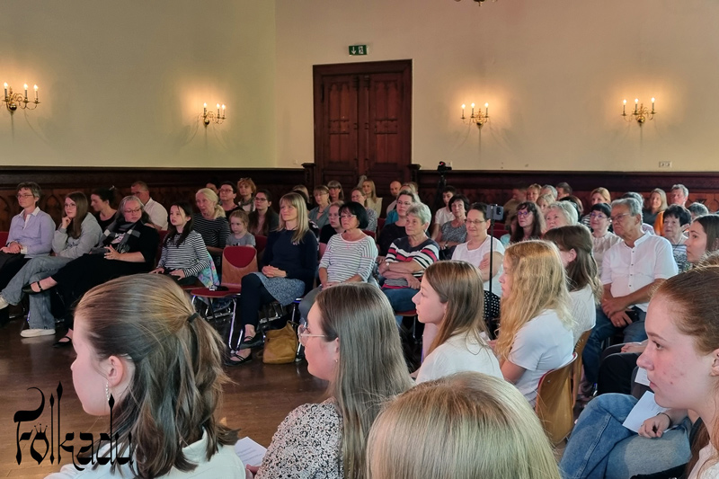 Die musikalische und sehr emotionale Reise fand ihren Höhepunkt in einem öffentlichen Konzert in der leider nicht ganz gefüllten Aula des Gymnasiums. Das Publikum war begeistert, ließ sich von den ausdrucksstarken Liedern und den charismatischen MusikerInnen mitreißen. Ein wunderbarer musikalischer und kulturverbindender Workshop endete hier und lässt auf eine Wiederholung hoffen. Eine Einladung der Band FOLKADU zum Rudolstadt Festival 2025 wäre da eine gute Gelegenheit ...