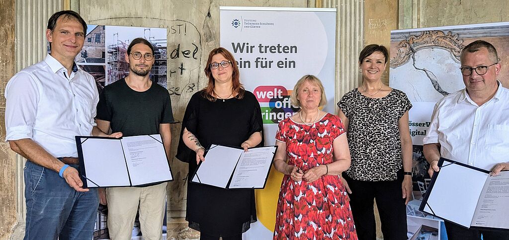 Kooperationsvertrag unterzeichnet: Christian Müller, Leiter Landessportschule Bad Blankenburg, Peter Merkel, Lehrer am Staatlichen Gymnasium Fridericianum Rudolstadt, Heike Gressler, Schulleiterin der Staatlichen Geschwister-Scholl-Regelschule Bad Blankenburg, Dr. Doris Fischer, Direktorin der Stiftung Thüringer Schlösser und Gärten (STSG), Dr. Anke Költsch, Projektkoordinatorin Außerschulischer Lernort Schloss Schwarzburg, STSG, Thomas Kniese, stellv. Schulleiter des Staatlichen Gymnasiums Fridericianum Rudolstadt, Foto: Henry Trefz