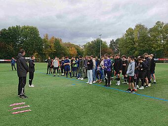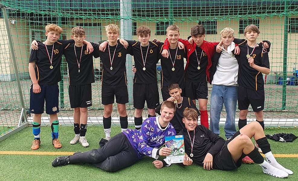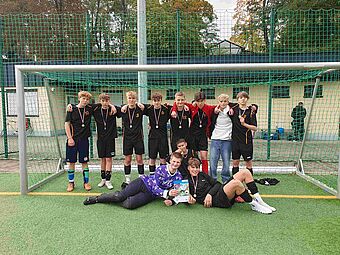 Jetzt heiß auf den Turniersieg versprach man sich gegen das Böllgymnasium besser zu agieren. Von Beginn an wurden die Räume zugemacht, Schlüsselspieler eng gedeckt und Torchancen auf gleicher Augenhöhe herausgespielt. Nach Abluf der Spielzeit stand es 0:0 - folglich 9m-Schießen. Sofort übernahmen 3 Schützen die Verantwortung (Max Majewski, Paul Schönefeld, Nick Engelhard). Max verwandelte sicher. Der Schütze vom Böllgymnasium scheiterte am überragend haltenden Torwart. Paul ließ bei seinem Schuss keine Fragen offen - 2:0. Und wieder scheiterte der Böllschuss am Torwart und somit stand der Turniersieger mit unserer Mannschaft fest.