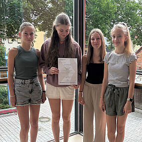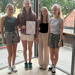 Ebenso erfolgreich haben sich 7 Schülerinnen der ehemaligen Klasse 7a im Bundeswettbewerb Fremdsprachen geschlagen. Mit einem Film und einem Audioprojekt erlangten sie eine Prädikatauszeichnung. Felicia Frenzel, Maja Muth, Lina Rausch und Emilia Ettrich mit dem Kurzkrimi „L ́enlèvement“ und Liliane Barthels, Lea Willenbring und Melissa Hüttl mit der Weihnachtsgeschichte „Les Elfes qui aident“.