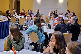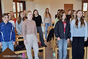 Die intensive Arbeit begann bereits am ersten Abend - in der ersten Probe standen die neuen Arrangements im Mittelpunkt, die in der folgenden Woche erarbeitet werden sollten. Bei ersten Lesedurchläufen konnten sich die Choristen einen Eindruck verschaffen. Danach - wie an jedem Abend - gab es noch etwas Freizeit, die die Sänger:innen auf ihrem Zimmer oder an der Tischtennisplatte verbrachten. Die Großen trafen sich später oben auf der "Couch", um gemeinsam mit dem Chorleiterteam über die Welt als solche zu sinnieren. Andererseits halfen sie auch, dass die Kleineren ihre Nachtruhe ordentlich einhalten konnten, was weitgehend gut funktionierte.