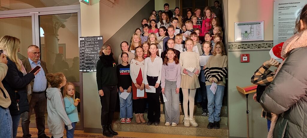 Zuvor fand am Fridericianum der traditionelle Schuladvent statt - dieses Mal als Teil des "Offenen Adventkalenders" der Stadt Rudolstadt. Der Nachwuchschor eröffnete im Foyer des Altbaus der Schule diese Ereignis mit drei vorweihnachtlichen Weisen. Vielen Dank an die jungen Choristen - das habt ihr sehr gut gemacht!