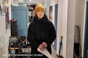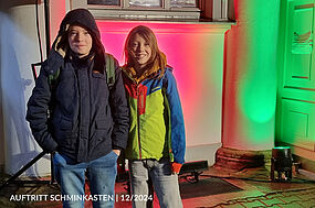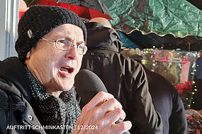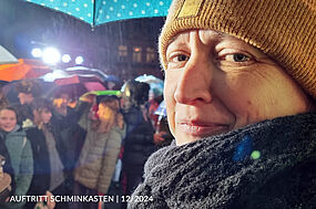 Und schließlich - kurz vor den wohlverdienten Weihnachtferien trotzten die SängerInnen des Nachwuchschores dem Regenwetter. Vor dem Schminkkasten des Theaters fand das traditionelle Weihnachtssingen - auch wieder im Rahmen des "Offenen Adventskalenders statt". Der Intendant Steffen Mensching begrüßte die Zuhörer- und MitsängerInnen mit nachdenklichen Worten und leitete über zum literarisch-musikailischem Reigen. Auch hier beteiligte sich der Nachwuchschor mit seinen eigenen Liedern und stimmte fröhlich in die adventlichen Gesänge, die von den Blechbläsern des Orchesters begleitet wurden mit ein.