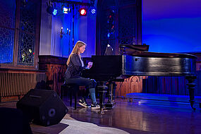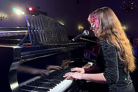 Ebenfalls langjährige Übung bringt Amalia Marie Pfenzig am Klavier mit. Sie stellte das Lied „Skinny Love" von der englischen Sängerin und Songwriterin „Birdy" in einer Instrumentalversion auf dem Klavier vor. Das Stück handelt von unglücklichen Beziehungen, die aus falschen Gründen aufrechterhalten werden. Dieser Schwere ließ sich auch in der melancholischen und emotionalen Interpretation an diesem Abend nachempfinden.