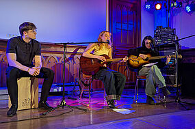 Nach den Filmmusikbeiträgen folgten romantische Musikstücke, die für sich selbst standen. Vier weitere Stücke zum Thema Liebe rundeten das Programm in der zweiten Hälfte des Abends ab. Das Trio, bestehend aus Helene Pilling (Gitarre und Gesang), Elli Gieß (Gitarre und Gesang) und Fynn Rößler (Cajon), stellte eine Interpretation von „L’AMOUR DE MA VIE“ von Billie Eilish vor. Im Mittelpunkt stand dabei Helene, die mit Gitarre und wunderschönem Gesang das Stück präsentierte. Dabei konnte auch sie auf eine langjährige Erfahrung im Chor zurückgreifen.