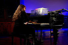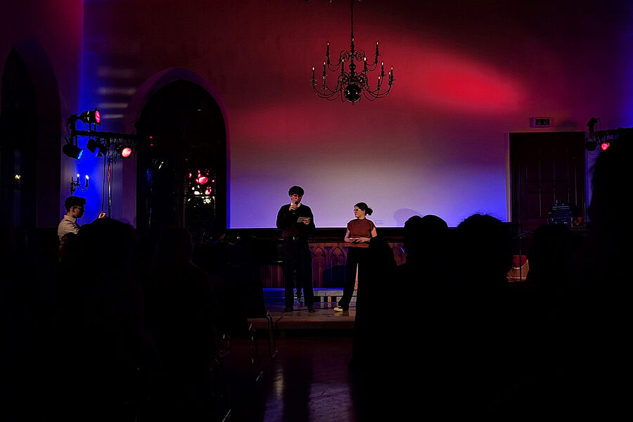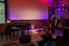 Anika Mitschke und Simon Schoetzau begleiteten die Zuhörer als Moderatoren durch das Programm und ermöglichten einen kurzen Einblick in die musikalische Laufbahn der Sänger*innen und Musiker*innen. Pünktlich um 19 Uhr konnte so das kleine Konzert mit Eindrücken aus der Filmmusik beginnen.